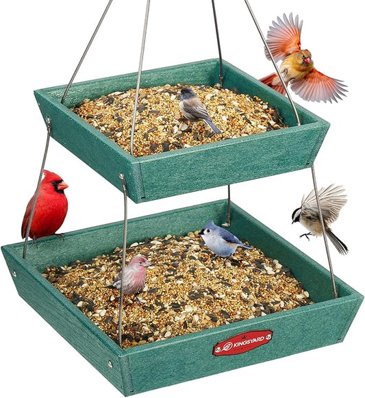 Kingsyard 2 Tier Platform Bird Feeder for Outdoors Hanging, Recycled Plastic Flat Bird Feeder Tray with Large Capacity 5 lbs, Garden Decoration Attracting Wildbirds, Green