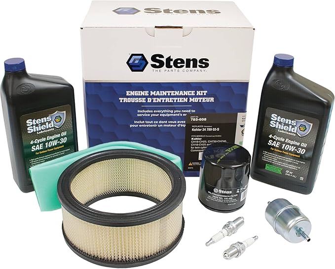 - Includes: Air Filter, Pre-Filter, Oil Filter, Two Maga-Fire Spark Plugs, Fuel Filter, Stens 4-Cycle Engine Oil (Two 32 -Ounce Bottles)