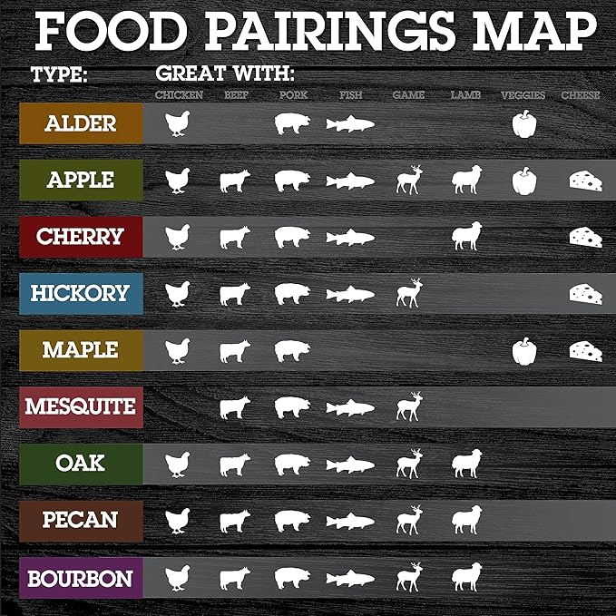 - Oak is a very popular flavor and works well when mixed with other woods, such as apple. Oak wood chips pair well with Poultry, beef, pork, seafood, lamb, game and sausages!