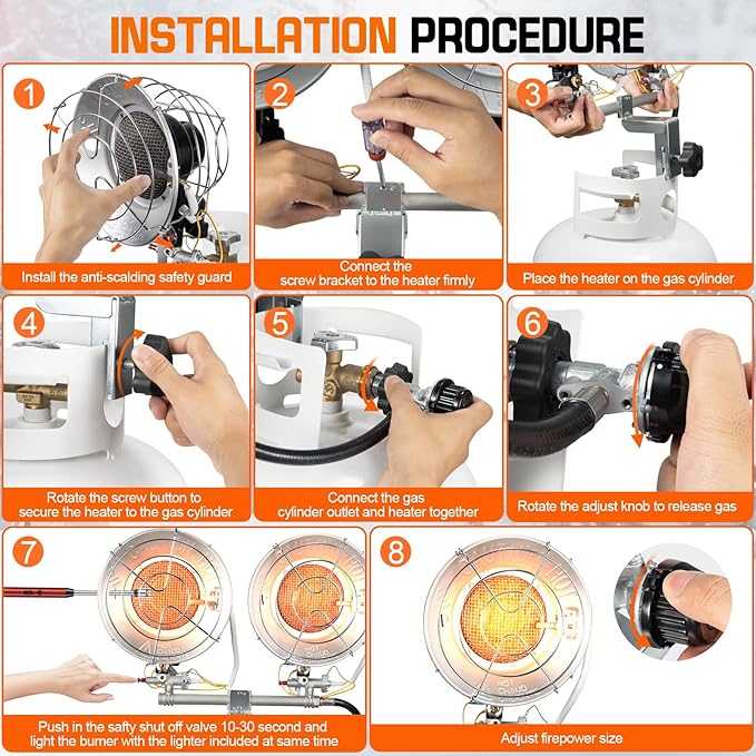 - đ„ăEasy to use Propane Patio HeaterăThe propane heater comes pre-assembled and can be easily attached to a 20 lb propane tank (not included) using the mounting bolt knobs. To ignite, press the safety shut-off valve and insert the included USB lighter through the ignition hole in the metal plate for a quick and safe start. Our propane heater is an ideal gift for outdoor enthusiasts, patio, garage, camping, RV travele.