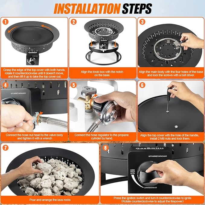 - .All-In-One Fire Pit Propane: Our outdoor gas fire pit comes with a cover and carry handle, a pre-attached 10-foot braid stainless hose to keep your standard 20-lb propane tank (not included) safely tucked away, a fully adjustable regulator with a chrome knob for controlling flame size, and a 4.8-lb natural lava rock set to enhance the flickering flame effect.