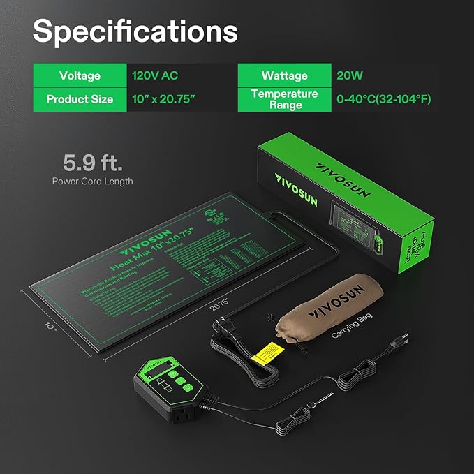 - Innovative Heating: With the radiate far-infrared light wave, this seedling heat mat makes the heat source softer and provides enough heat, which can be heated up to 40 ℃(104℉)at an ambient temperature of 20-25 ℃(68-77℉)in minutes; We recommend using it with the VIVOSUN thermostat controller and humidity dome