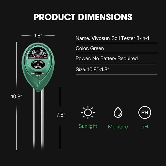 VIVOSUN Soil Tester, 3-in-1 Plant Moisture Meter Light and PH Tester for Home, Garden, Lawn, Farm, Indoor and Outdoor Use, Promote Plants Healthy Growth