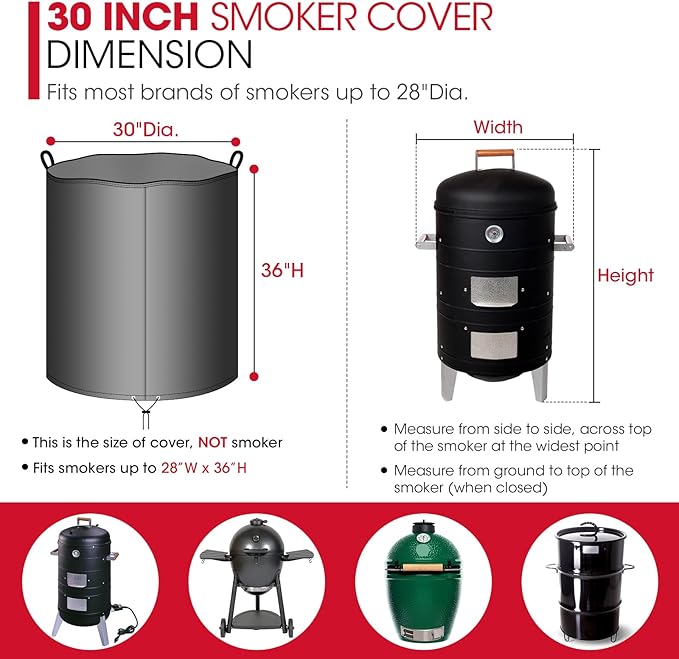 - 30 Inch Smoker Cover Dimension: 30 inch round smoker cover measures 30"Dia x 36"H, compatible for most brands of smokers up to 28"Dia. Such as Char-Griller, Akorn, Kamado, Weber Smokey Mountain, Pit Barrel Cooker, Big Green Egg, Recteq Matador and more. ※Be sure to measure your smoker first to determine the correct cover size