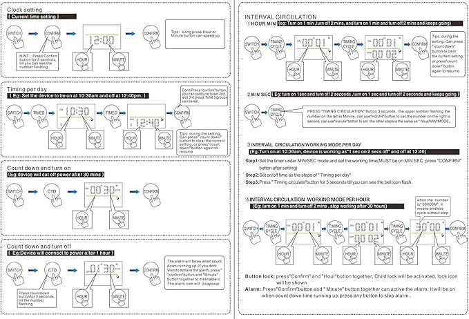 - Multifunctional save energy and money: Clock setting; Timing per day (3 groups can be set at the same time); Count down and turn on/off (warning tone can be selected); Interval circulation(Infinite loop and Shortest time interval is 1 second)