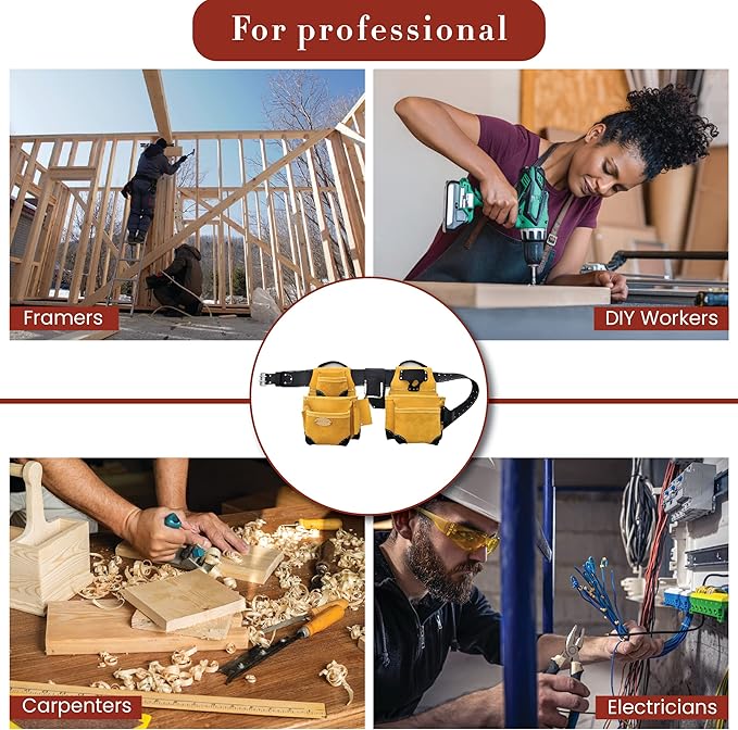 - Versatile Tool Belt: Equipped with 17 pockets, including six internal pockets, our framer’s leather tool belt combo has a unique double pouch design. Our tool pouch's discrete and unique construction provides convenience and enhances tool accessibility