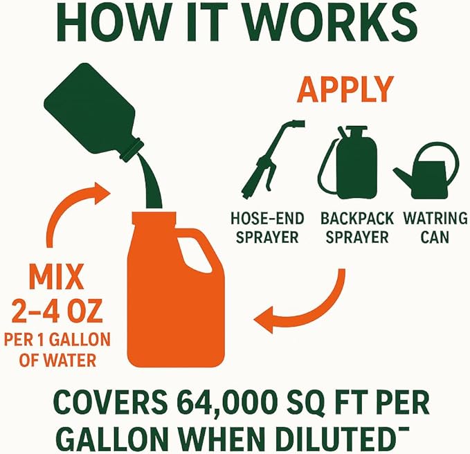 - EASY TO APPLY FOR NATURAL GREAT RESULTS: Stir or mix well before each use. Mix 2- 4 ounces of Green Envy per gallon of water. Spread at a rate of approximately 1 gallon of prepared mixture per 1000 sq ft of lawn. Mixes well with other products may be added to fertilizer applications. Irrigation is not required after application. Any sprayer will work, but for large areas, the hose end sprayer is the easiest. 1 gallon of this organic fertilizer for lawns will yield up to 64 gallons.