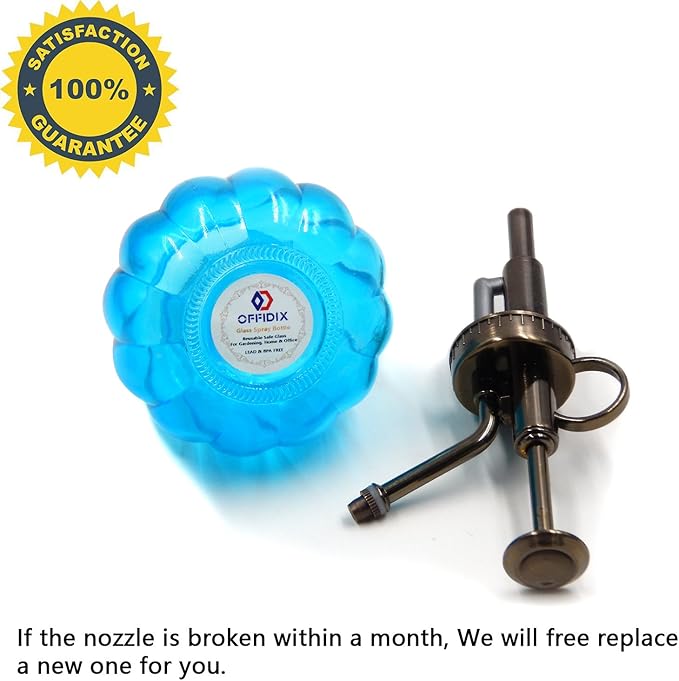 OFFIDIX Glass Watering Spray Bottle, 6.3" Tall Vintage Style with Bronze Plastic Top Pump One Hand Watering Can Spray Bottle (Light Blue)