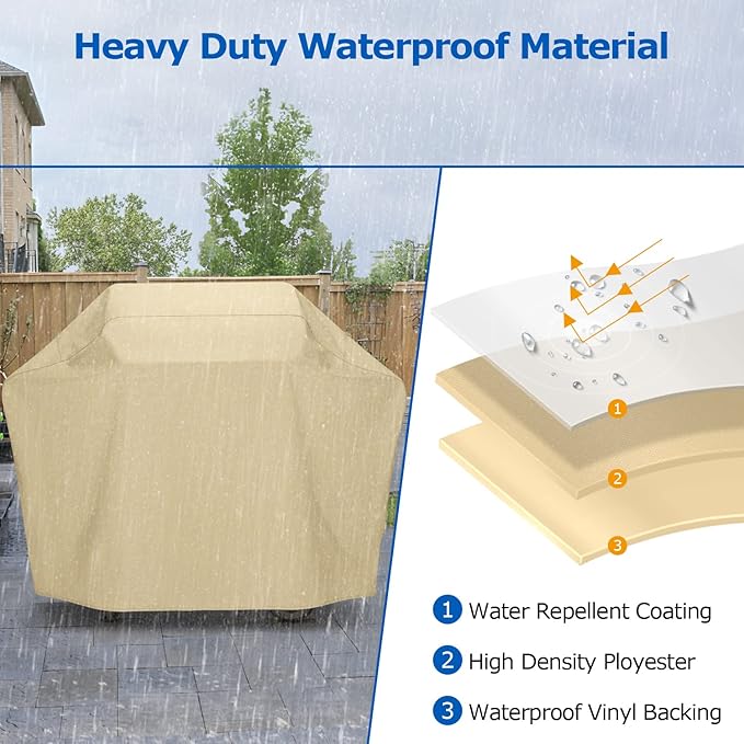 - All Weather Resistant BBQ Cover - The gas grill cover is made of premium high density fabric in beige with waterproof vinyl coating, resists fading, tearing and cold cracking, delivers long-term protection and superior durability, protects your grill from sun damage, rain, snow, dust, and debris all year round.
