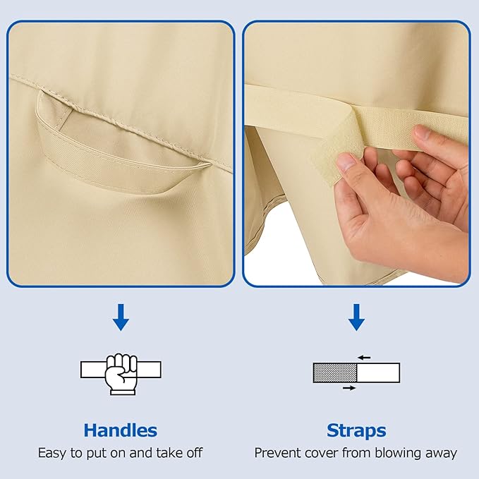 - Convenient Handles - Two useful fabric handles on top of the patio barbecue grill cover make it easy to put on and take off from the grill, also can be used as loops to hang up at side when not in use.