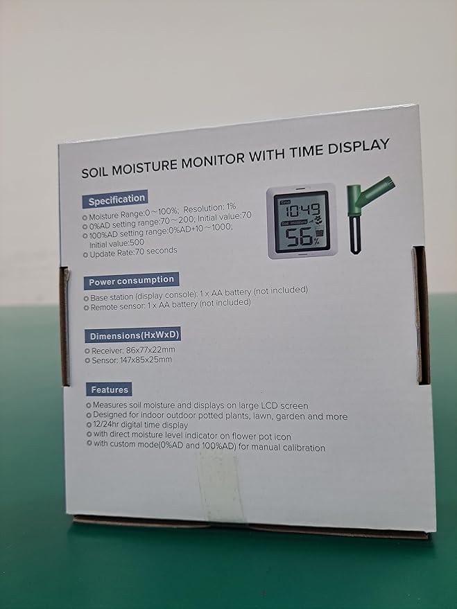 - Time Display: With 12/24hr digital time display; 2 AA batteries(not included) needed for the display console and soil moisture sensor(one for each)