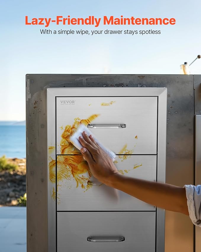 - Premium Details: The stainless steel BBQ drawers were built with a lot of consideration, providing maximum convenience and security. Integrated high-end design, no drilling required for installation, good for sealing. Round corners can reduce scratches while in use; a sleek handle allows you to open the drawer effortlessly. The seamless design can keep your inside items dry and secure.