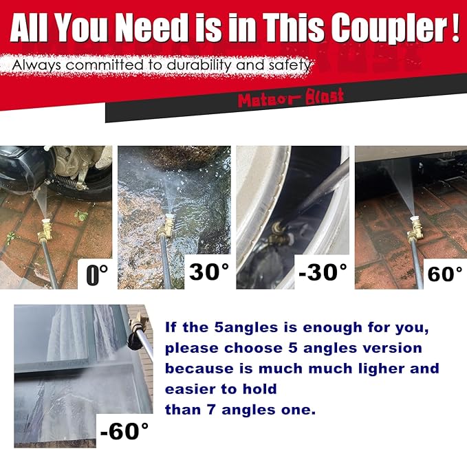 Meteor Blast Pivoting Coupler, 120 Degree with 5 Angles, heavy duty design and Stainless Steel Safety Lock for Pressure Washer Spray Nozzle, Clean Hard to Reach Area, 5000PSI, 1/4” Quick Connect
