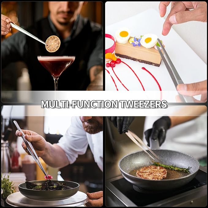 - PROFESSIONAL KITCHEN TWEEZERS - You can use tweezers to pick up some fine food, like pasta, caviar, kernels of corn, pine nuts and cranberries. It also good for decorate desserts, cakes and drinks. Is also perfect tool for grilling and flipping food