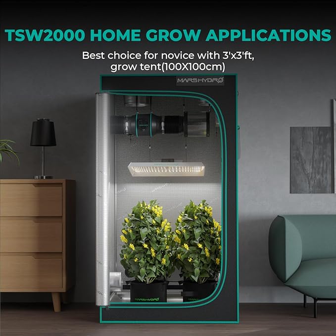 - Material : Quiet & Durable: TSW2000 grow light is designed with a high reflective and noise-free fanless professional LED grow system. The quickly heat dispersing material aluminum reduces light lost to aisles and walls, increasing light intensity up to 20% and allowing your plants to receive more energy without the risk of burning. Quiet & Durable: TSW2000 grow light is designed with a high reflective and noise-free fanless professional LED grow system. The quickly heat dispersing material alumi… See more