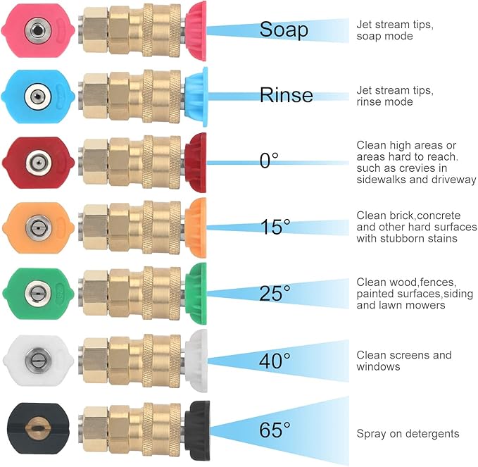 - SEVEN DIFFERENT ANGLES SPRAY NOZZLES - Another appealing feature of this nozzle tips kit is that it contains 7 different degrees spray tips. These are seven different color-coded spray nozzles that work in various degrees, including 0°, 15°, 25°, 40°, 65°, Risen and Soap. They give you the ability and freedom to choose the nozzle tips depending upon your needs and preferences, speeding up the cleaning process at the same time.