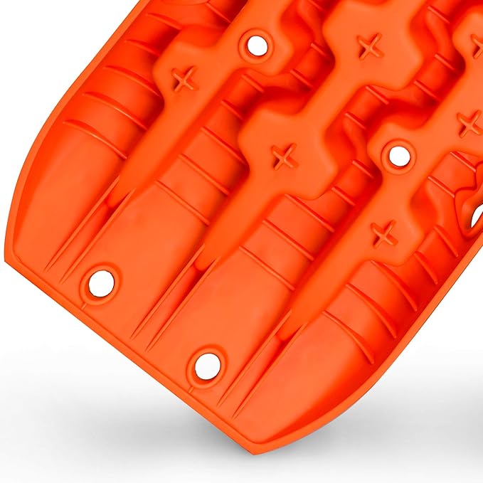 - The cross-shaped teeth, well positioned to bite the tyres to prevent vehicle from slipping back, will not melt against drastic wheel spin, and contoured ramps are designed for an easier entering under the tyre and drive up.The bottom of X-BULL recovery tracks adopts the same construction of the front to significantly increase friction and can also be used to get your vehicle unstuck.