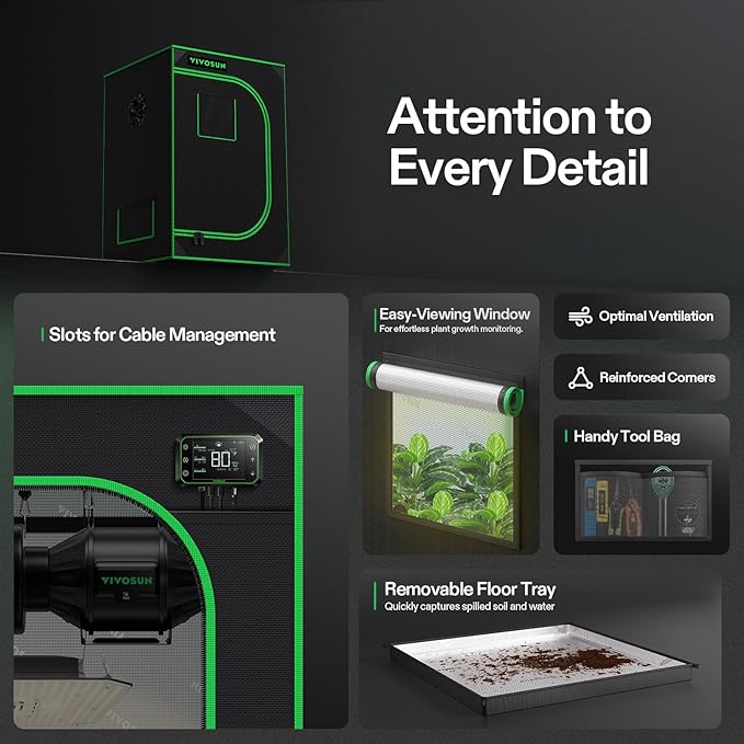 - Easy Observation & Maintenance: With a visible window made by transparent plastic set on the grow tent, you can check the growth status of your plants at any time; The window at the bottom is helpful for heat dissipation; The hook and loop fasteners on the cover of the window are easier for you to open and observe inside; It is also equipped with a removable floor tray that is convenient to be cleaned and conserved