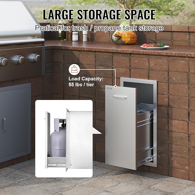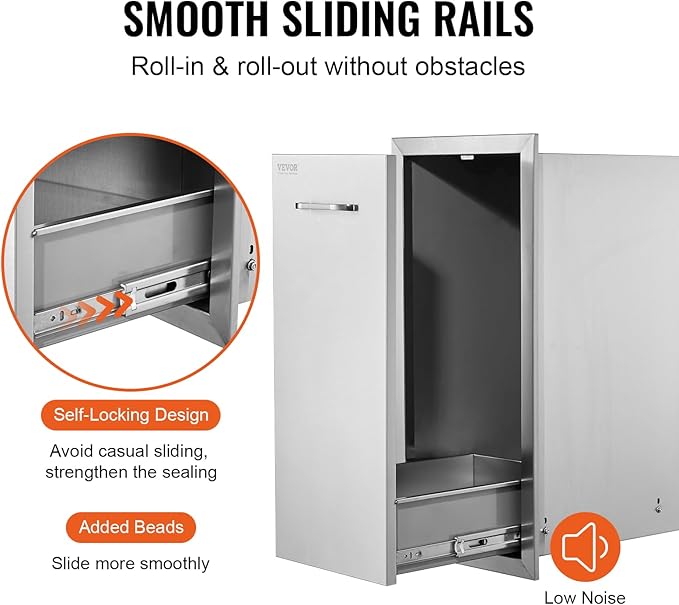 VEVOR Pull Out Trash Drawer 13.4"W x 25.7"H x 19.6"D Lower Sliding Rails Steel Roll Out Trash Bin Pull Out Tray Outdoor Kitchen Trash Drawer with Handle for BBQ Island Grill Station No Trash Can