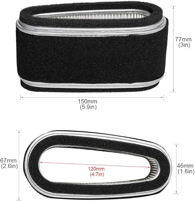 - 3. Air filter Length 6 inch; Width At Narrow End 2 inch; Width At Wide End 2-5/8 inch; Height 3 inch; Oil Filter Size: OD: 2-11/16"; Height: 3"; Thread Size: 3/4 " -16; Micron: 25; 9-12 PSI pressure relief; Anti-drain.