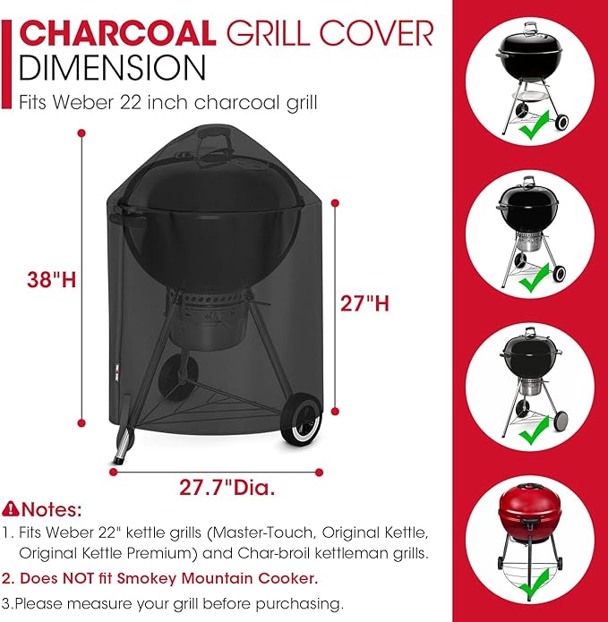 - Custom Fit: The Kettle grill cover measures 27.7"Dia. x 38"H, compatible with Weber 22" Master-Touch, Original Kettle, and Original Kettle Premium. Does not fit Smokey Mountain Cooker. Compare to Weber 7150 grill cover. Be sure to measure your grill first to determine the proper cover
