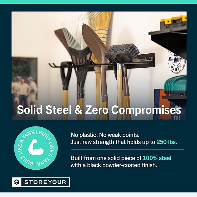 - ULTRA-STRONG & BUILT TO LAST – Made from 100% solid steel with no plastic parts or assembly required, this tool rack is crafted to withstand heavy-duty use. Each wall-mounted storage rack arrives fully welded and powder-coated to resist rust and corrosion. Perfect for organizing tools, outdoor storage gear, or even a fishing pole rack for the garage.