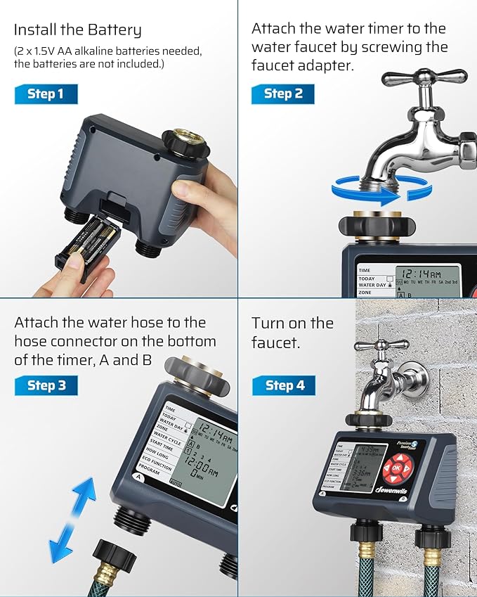 - [Hassle free on Vacation] Powered by 2 1.5V AA batteries (not included), the low battery indicator warning helps to replace battery in time, once forget to replace it when you are away on holiday, the hose timer for watering will keep OFF to avoid overwatering to save your garden and conserve water; when power is back on, just reset the current time, the previous watering schedules are still kept