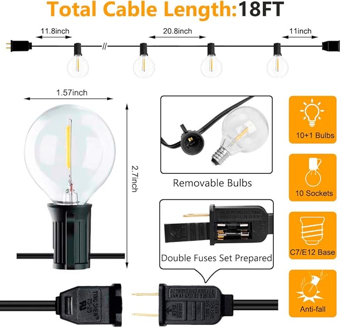 - 【18FT G40 Globe String Lights】Totally with 10 sockets(E12 Base),11 plastic clear G40 Bulbs( 1 spare),Shatterproof,save over 90% energy over incandescent bulbs.The 2700K soft warm lighting is perfect for creating romantic atmosphere for wedding, warm family reunion,party and etc.