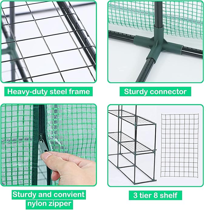 - Sturdy: Green houses for outside winter structured with sturdy rust-resistant steel pipes. The 16 clip-shelf fixers prevent the shelf from moving. Anchors and ropes help stabilize the portable greenhouse and prevent being blown down by strong winds.