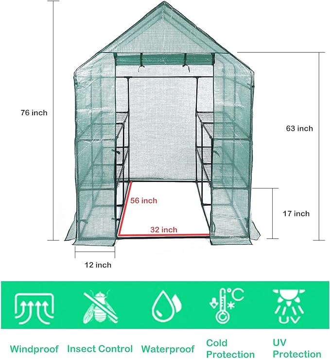 - Large Space: Outdoor greenhouse on both sides with 3 tiers 8 shelves, each shelf 12" wide holds more plant pots, 17" high between each tier to provide ample space for plant growth. The middle 32"x56"x77" space is big enough for you to place more tall plants or move around for work.