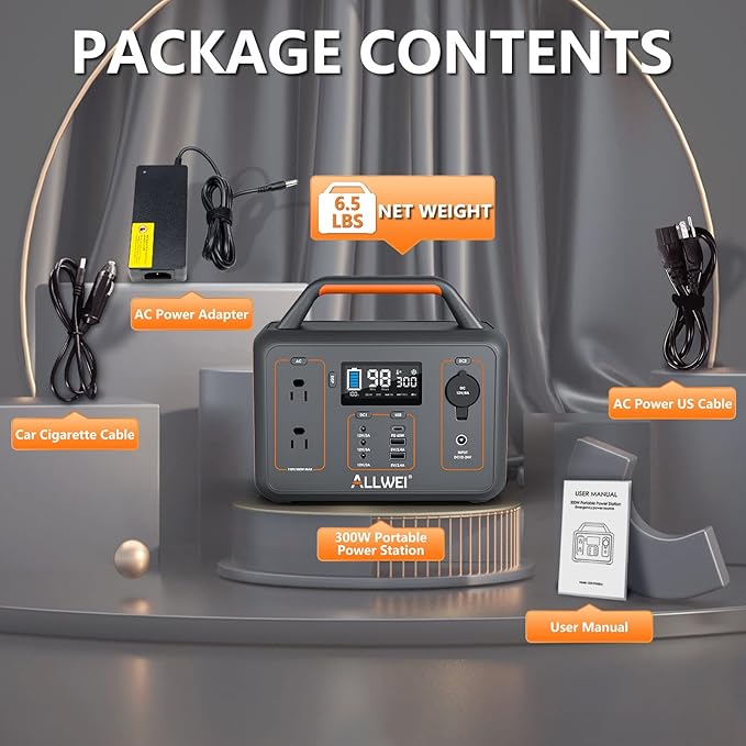 - 【Package Contents】1x ALLWEI 300W/280Wh Portable Power Station, 1x AC Power Adapter, 1x AC Cable, 1x DC Car Cable, 1x User Manual (ALLWEI Solar Panel sold separately).
