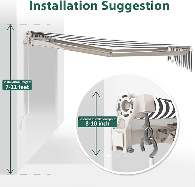 - [Installation Instructions] - Awning, crank handle, bracket, 2 Retractable mounting brackets, instruction manual and additional mounting hardware - open/close by hand crank. Note:Please prepare the following tools before installation(notincluded withthe product):Power drill with drilling bit, Tape, Wrench.
