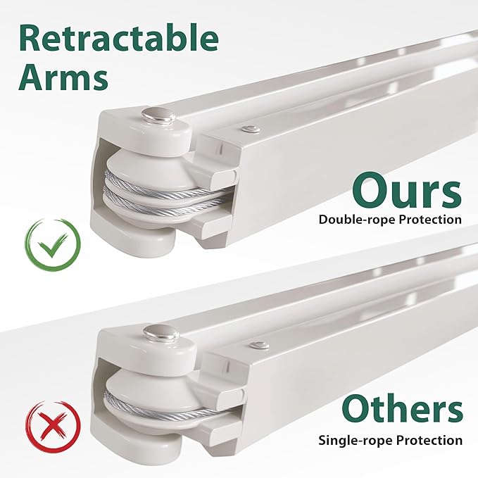 - [Retractable Arms] - Aluminium & Steel Frame and Double-Rope in Retractable Torsion Bars to keep safe.