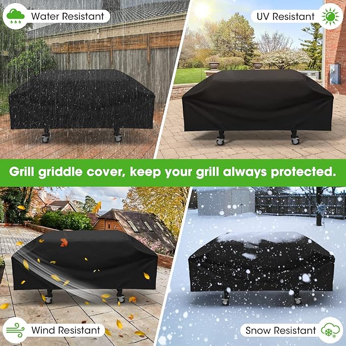 - Waterproof Protection: This outdoor grill cover is designed to fully protect your flat-top griddle. The thick, durable fabric with professionally taped seams at critical parts to provide powerful guard against water leaking