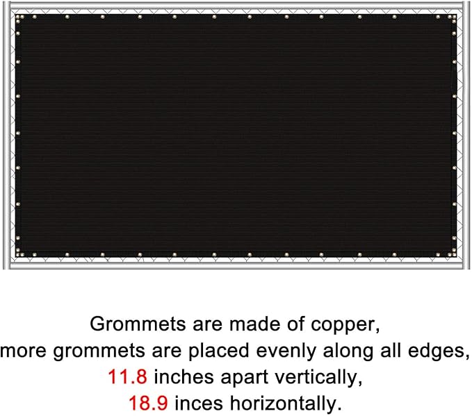 - More intensive grommets: Grommets are made of copper, more grommets are placed evenly along all edges, 11.8 inches apart vertically, 18.9 inches horizontally. All edges are covered with black reinforced 1.3" binding. The grommets and bindings help the screen to hold up in the wind.