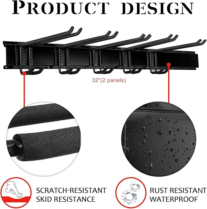 - Adjustable Rubber-coated Hooks: The hooks of the garden tool organizer for garage are rubber-coated (will not scratch the tool handles) and removable, you can customize the spacing between the hooks on the 32" steel rail (2 panels) to meet your needs. Its ease of adjustability makes it quite dynamic if your tool storage needs a change