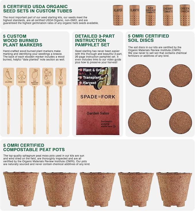 - Spade To Fork Kits - Our company is family owned and operated right here on our 65 acre farm in rural Oregon. Each Spade To Fork indoor growing system set contains 5 types of Certified USDA Organic Non GMO seeds, including San Marzano Tomato + Early Cherry Tomato + Early Jalapeño + Cilantro (slow bolt) + Green Onion Seeds ; 5 OMRI certified compostable peat pots; 5 OMRI certified rich potting soil discs; 5 custom wood burned plant markers; our beautiful and helpful 26pg growing guide