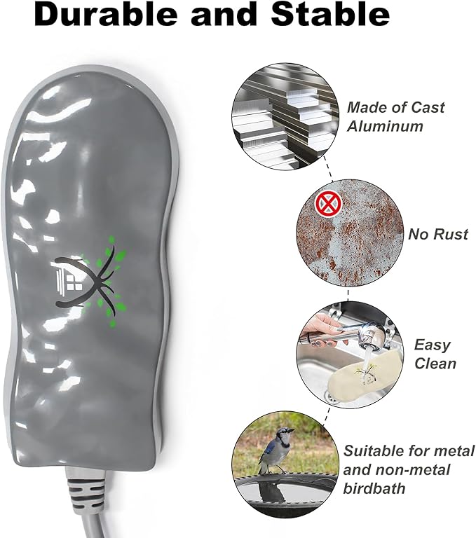 - DESIGN: Designed for standard size birdbaths, this outdoor bird bath de-icer can be used in different kinds of birdbaths, such as metal, plastic, stone or glass birdbath or container, the waterproof immersion deicer will not melt the plastic bird bath, this bird bath heater is safe for both metal and non-metal containers.