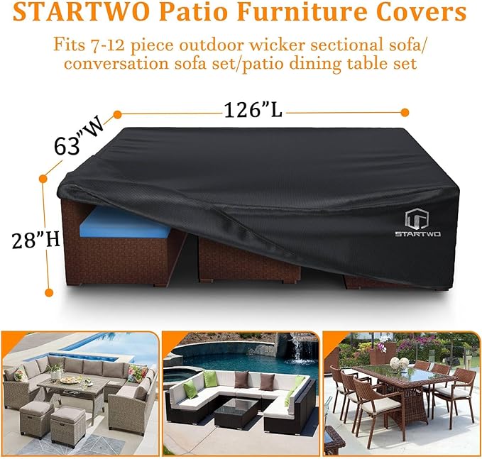 - 【Universal Size】STATRWO Patio furniture cover measures 126”L x 63''W x 28'' H, It fits for larger outdoor furniture, 7-12 piece outdoor sectional sofa, conversation set, rectangular or oval garden dining table chairs set. Please measure the size of your furniture set before purchasing.