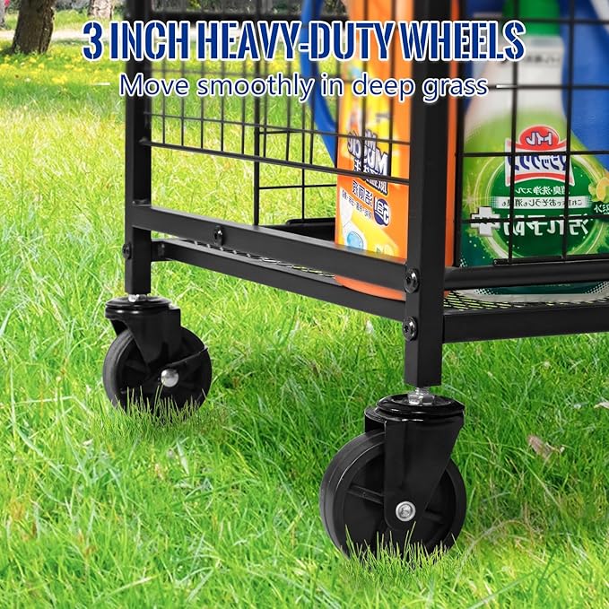 - 【Heavy Duty Wheel Design】This lawn tool cart comes with 4 heavy-duty wheels which is 3 inch, can move smoothly in deep grass and can easily move from inside to outside. Floor mounting rack keep your tools easily reach and get when needed.