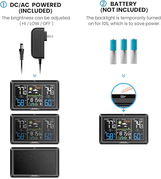 - [Weather Stations with Adjustable Backlight] When powered by the batteries(not included), to save power, the backlight is on for 10S. When plugged in the power adapter, the backlight can be kept on and 3 levels of brightness can be adjusted.(High-Low-Off)
