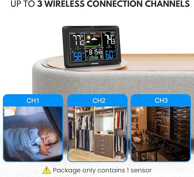 - [Weather Stations Wireless Indoor Outdoor Multiple Sensors] The digital weather station has 3 remote channels, which can detect multiple locations such as baby room, storage room, wine cellar, vegetable shed, etc. Note: the package contains 1 sensor.