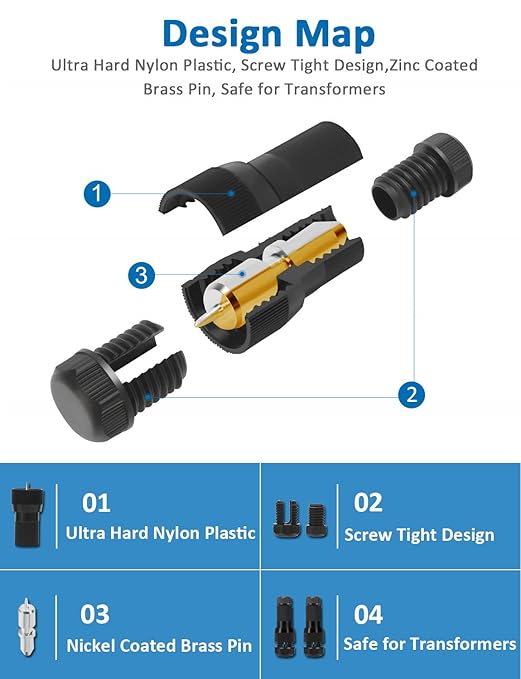 - Ultra Strong Nylon Plastic and Brass Pin: SUNVIE landscape lighting connectors are made of extremely sturdy nylon plastic + fiberglass mixture and CNC machined nickel- plated brass pins to ensure corrosion resistance and electrical conductivity for outdoor use.