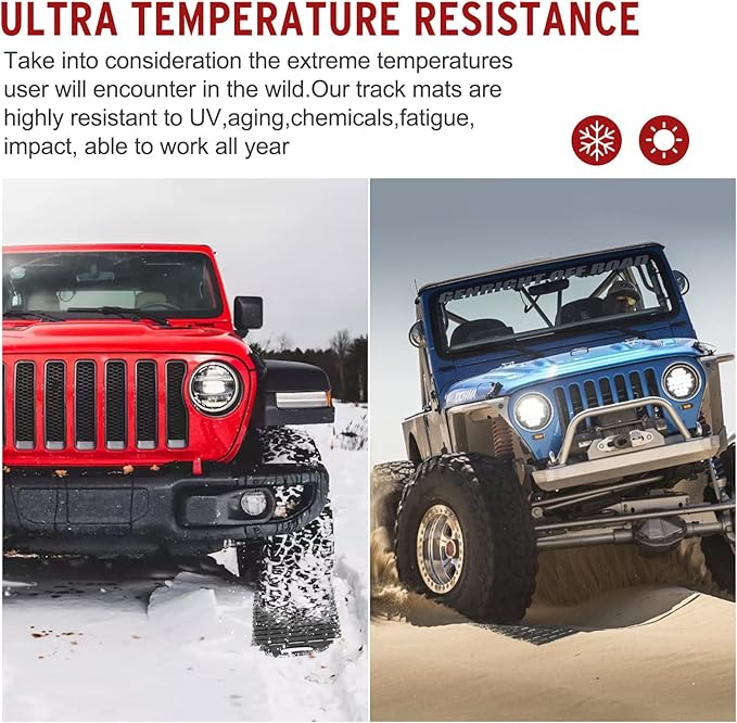 - Work all Year: Taking into consideration the extreme temperatures user will encounter in the wild.Our track mats are highly resistant to UV,aging,chemicals,fatigue,impact,able to work all year,ideal for off-road use
