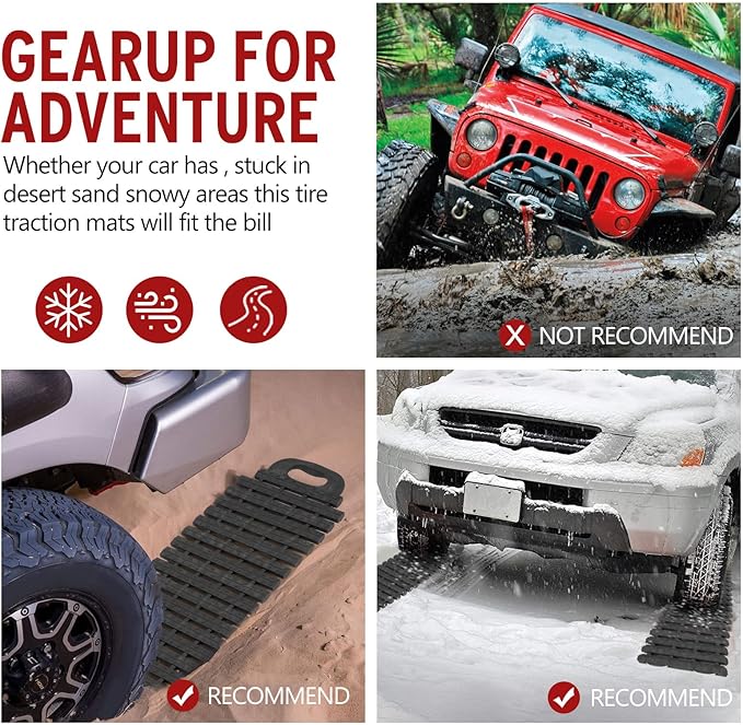 - Get your 4WD out of any Situation: Recovery tire traction mat give you the maximum traction and prevent vehicle tires from spinning on snow, ice or sand.You Can get vehicle unstuck from any situation