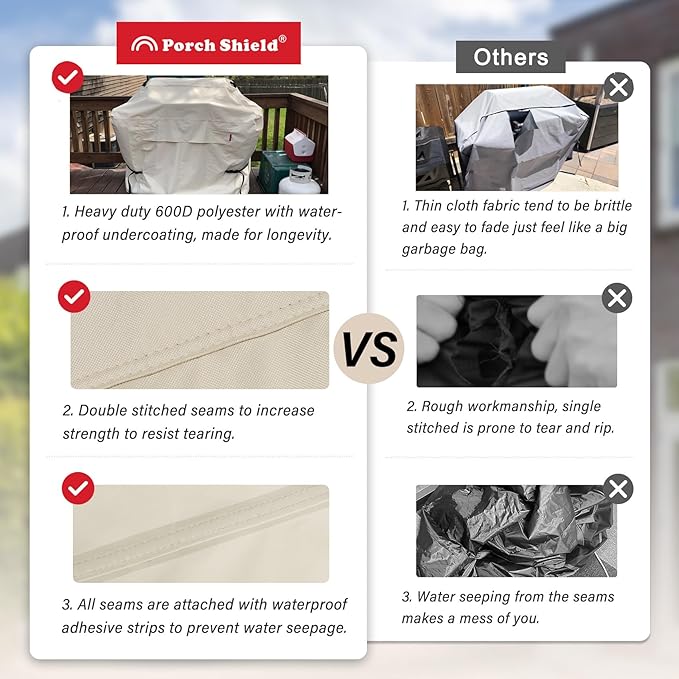 - Fadeproof & Waterproof Material - Porch Shield grill cover is made of 600D tough polyester with waterproof undercoating. UV resistant treatment makes it stay vibrant for years. Enhanced with double stitched and sealed seams to prevent the bbq cover against sun, rain, snow, wind, and dust.