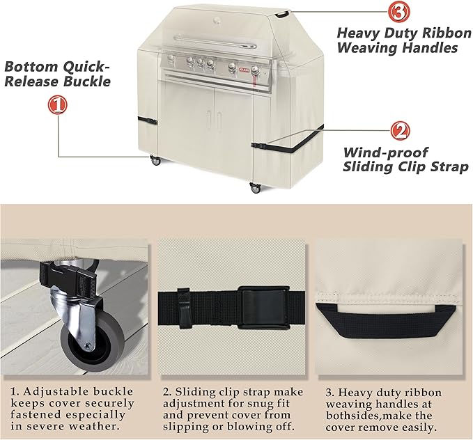 - Integrated Protection Systems - Adjustable click-close straps ensure a snug fit. Bottom buckle straps secure the grill cover tightly to fight wind. Large air vents avoid internal condensation.