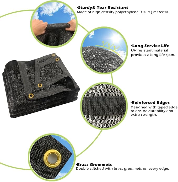 - Durable and Weather-Resistant Protection: Made from high-quality, UV-resistant HDPE, greenhouse shade cloth is designed for exceptional durability. Its tightly woven, tear-resistant design withstands intense sunlight, wind, and rain. The fabric resists fraying, fading, and degradation, providing long-lasting protection for plants, animals, and outdoor living place. This greenhouse shade cloth retains strength and performance over time, making it ideal for extended outdoor use in any weather