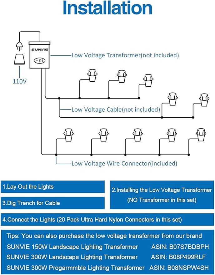 - 【Safe and Easy to install】12-24V input voltage, compatible with most low voltage landscape lighting transformers. Including 16 unique SUNVIE screw tight designed low voltage wire connector. Easier and safer to install and use. (Transformer required to convert 110V to 12V-24V, not included)