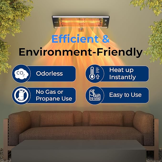 - INSTANT WARMTH: Enjoy our patio heaters for outdoor use, mountable on walls or ceilings, providing sun-like heat in seconds—no gas required. With the convenient remote control, warmth is just a button away.